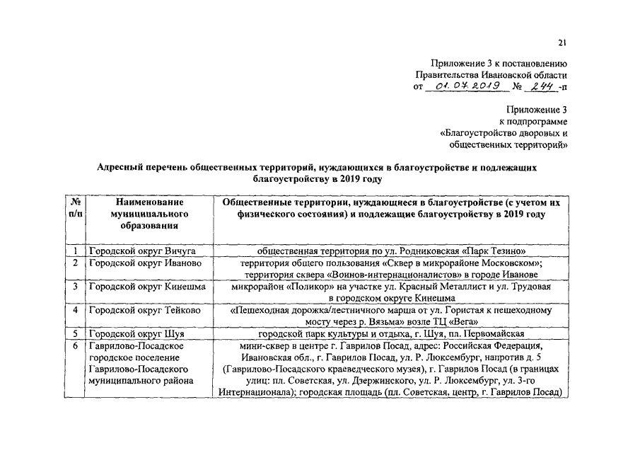 Постановление Правительства Ивановской области от 01.07.2019 N 244-п "О внесении изменений в постановление Правительства Ивановской области от 01.09.2017 N 337-п "Об утверждении государственной программы Ивановской области "Формирование современной городской среды" на 2018 - 2022 годы" (вместе с "Адресным перечнем общественных территорий, нуждающихся в благоустройстве и подлежащих благоустройству в 2019 году")