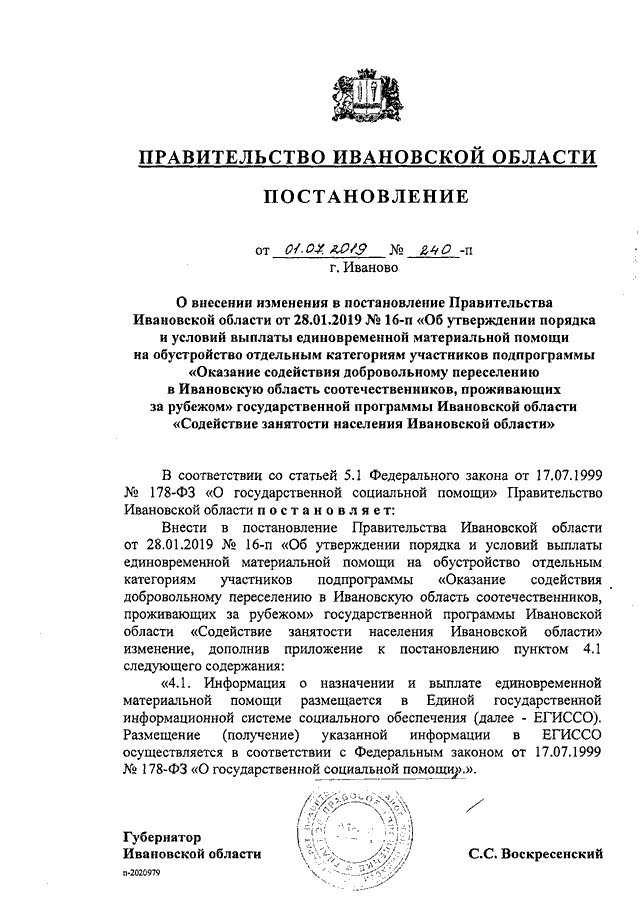 Постановление Правительства Ивановской области от 01.07.2019 N 240-п "О внесении изменения в постановление Правительства Ивановской области от 28.01.2019 N 16-п "Об утверждении порядка и условий выплаты единовременной материальной помощи на обустройство отдельным категориям участников подпрограммы "Оказание содействия добровольному переселению в Ивановскую область соотечественников, проживающих за рубежом" государственной программы Ивановской области "Содействие занятости населения Ивановской области"