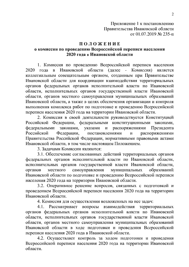 Постановление Правительства Ивановской области от 01.07.2019 N 235-п "Об образовании комиссии по проведению Всероссийской переписи населения 2020 года в Ивановской области" (вместе с "Положением о комиссии по проведению Всероссийской переписи населения 2020 года в Ивановской области")
