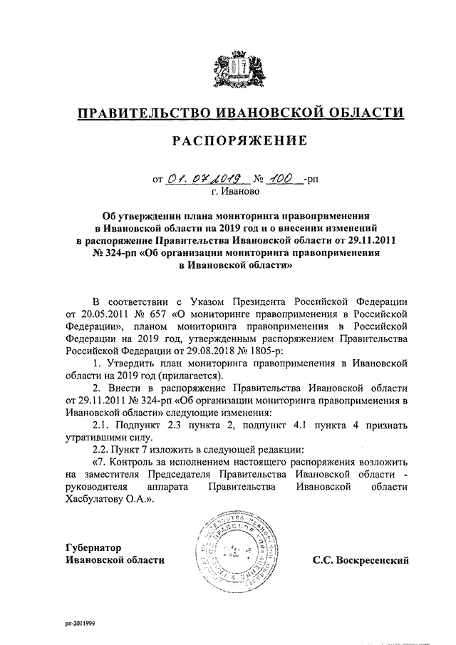 Распоряжение Правительства Ивановской области от 01.07.2019 N 100-рп "Об утверждении плана мониторинга правоприменения в Ивановской области на 2019 год и о внесении изменений в распоряжение Правительства Ивановской области от 29.11.2011 N 324-рп "Об организации мониторинга правоприменения в Ивановской области"
