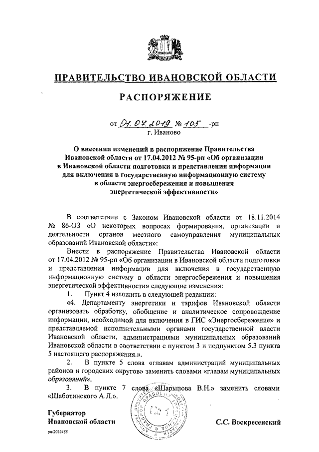 Распоряжение Правительства Ивановской области от 01.07.2019 N 105-рп "О внесении изменений в распоряжение Правительства Ивановской области от 17.04.2012 N 95-рп "Об организации в Ивановской области подготовки и представления информации для включения в государственную информационную систему в области энергосбережения и повышения энергетической эффективности"