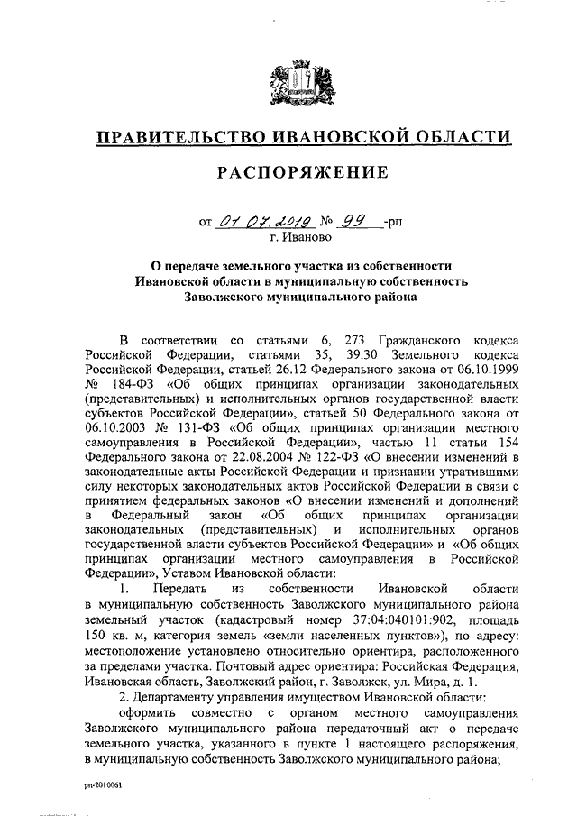 Распоряжение Правительства Ивановской области от 01.07.2019 N 99-рп "О передаче земельного участка из собственности Ивановской области в муниципальную собственность Заволжского муниципального района"