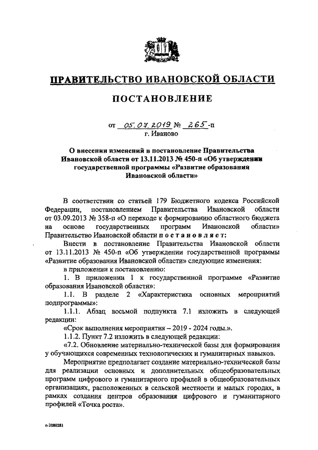 Постановление Правительства Ивановской области от 05.07.2019 N 265-п "О внесении изменений в постановление Правительства Ивановской области от 13.11.2013 N 450-п "Об утверждении государственной программы "Развитие образования Ивановской области"