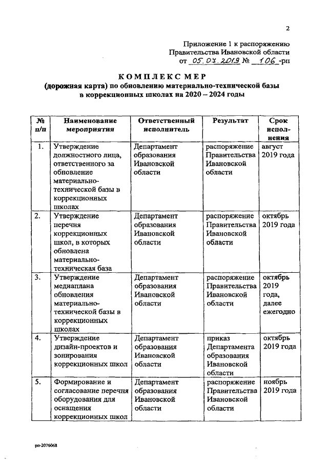 Распоряжение Правительства Ивановской области от 05.07.2019 N 106-рп "Об утверждении комплекса мер (дорожной карты) по обновлению материально-технической базы в коррекционных школах на 2020 - 2024 годы и концепции по обновлению материально-технической базы в организациях, осуществляющих образовательную деятельность исключительно по адаптированным общеобразовательным программам, в том числе для реализации предметной области "Технология" с учетом особых образовательных потребностей контингента обучающихся, на 2020 - 2024 годы"
