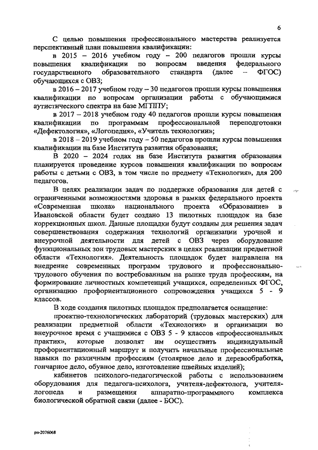 Распоряжение Правительства Ивановской области от 05.07.2019 N 106-рп "Об утверждении комплекса мер (дорожной карты) по обновлению материально-технической базы в коррекционных школах на 2020 - 2024 годы и концепции по обновлению материально-технической базы в организациях, осуществляющих образовательную деятельность исключительно по адаптированным общеобразовательным программам, в том числе для реализации предметной области "Технология" с учетом особых образовательных потребностей контингента обучающихся, на 2020 - 2024 годы"