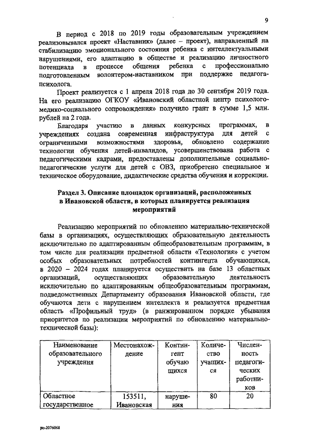 Распоряжение Правительства Ивановской области от 05.07.2019 N 106-рп "Об утверждении комплекса мер (дорожной карты) по обновлению материально-технической базы в коррекционных школах на 2020 - 2024 годы и концепции по обновлению материально-технической базы в организациях, осуществляющих образовательную деятельность исключительно по адаптированным общеобразовательным программам, в том числе для реализации предметной области "Технология" с учетом особых образовательных потребностей контингента обучающихся, на 2020 - 2024 годы"