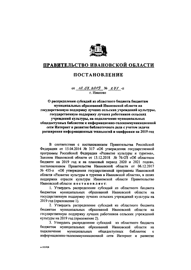 Постановление Правительства Ивановской области от 10.07.2019 N 271-п "О распределении субсидий из областного бюджета бюджетам муниципальных образований Ивановской области на государственную поддержку лучших сельских учреждений культуры, государственную поддержку лучших работников сельских учреждений культуры, на подключение муниципальных общедоступных библиотек к информационно-телекоммуникационной сети Интернет и развитие библиотечного дела с учетом задачи расширения информационных технологий и оцифровки на 2019 год"