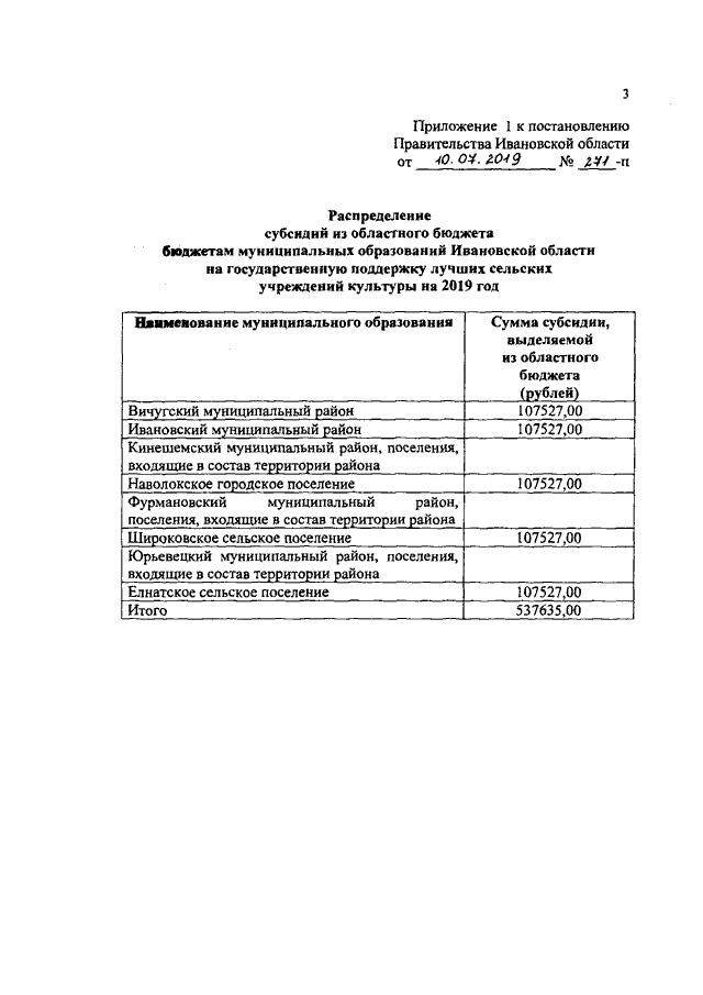 Постановление Правительства Ивановской области от 10.07.2019 N 271-п "О распределении субсидий из областного бюджета бюджетам муниципальных образований Ивановской области на государственную поддержку лучших сельских учреждений культуры, государственную поддержку лучших работников сельских учреждений культуры, на подключение муниципальных общедоступных библиотек к информационно-телекоммуникационной сети Интернет и развитие библиотечного дела с учетом задачи расширения информационных технологий и оцифровки на 2019 год"