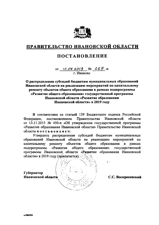 Постановление Правительства Ивановской области от 10.07.2019 N 269-п "О распределении субсидий бюджетам муниципальных образований Ивановской области на реализацию мероприятий по капитальному ремонту объектов общего образования в рамках подпрограммы "Развитие общего образования" государственной программы Ивановской области "Развитие образования Ивановской области" в 2019 году"