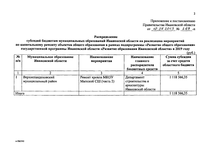 Постановление Правительства Ивановской области от 10.07.2019 N 269-п "О распределении субсидий бюджетам муниципальных образований Ивановской области на реализацию мероприятий по капитальному ремонту объектов общего образования в рамках подпрограммы "Развитие общего образования" государственной программы Ивановской области "Развитие образования Ивановской области" в 2019 году"