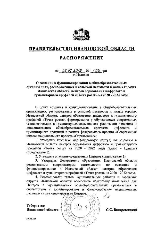 Распоряжение Правительства Ивановской области от 05.07.2019 N 107-рп "О создании и функционировании в общеобразовательных организациях, расположенных в сельской местности и малых городах Ивановской области, центров образования цифрового и гуманитарного профилей "Точка роста" на 2020 - 2022 годы"