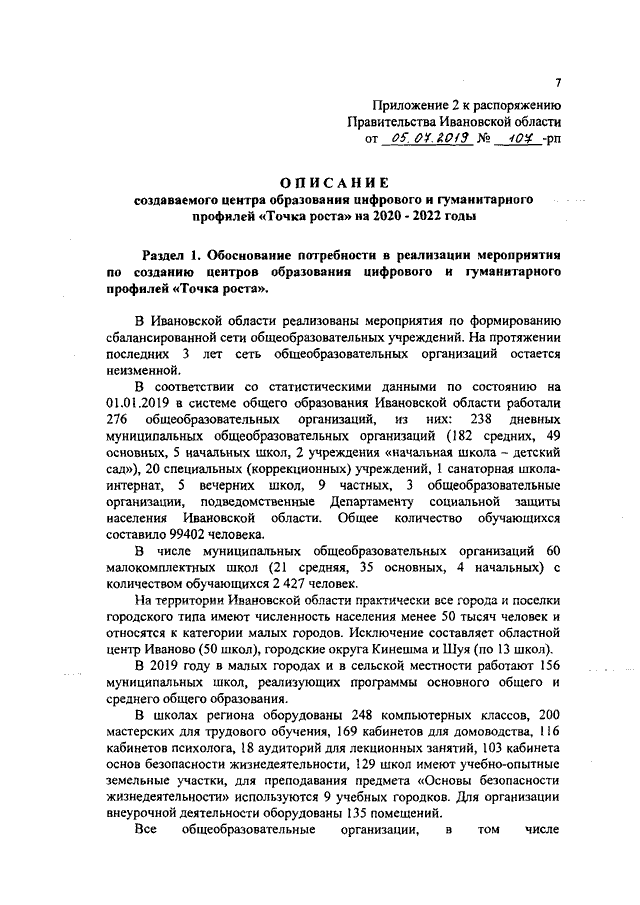 Распоряжение Правительства Ивановской области от 05.07.2019 N 107-рп "О создании и функционировании в общеобразовательных организациях, расположенных в сельской местности и малых городах Ивановской области, центров образования цифрового и гуманитарного профилей "Точка роста" на 2020 - 2022 годы"