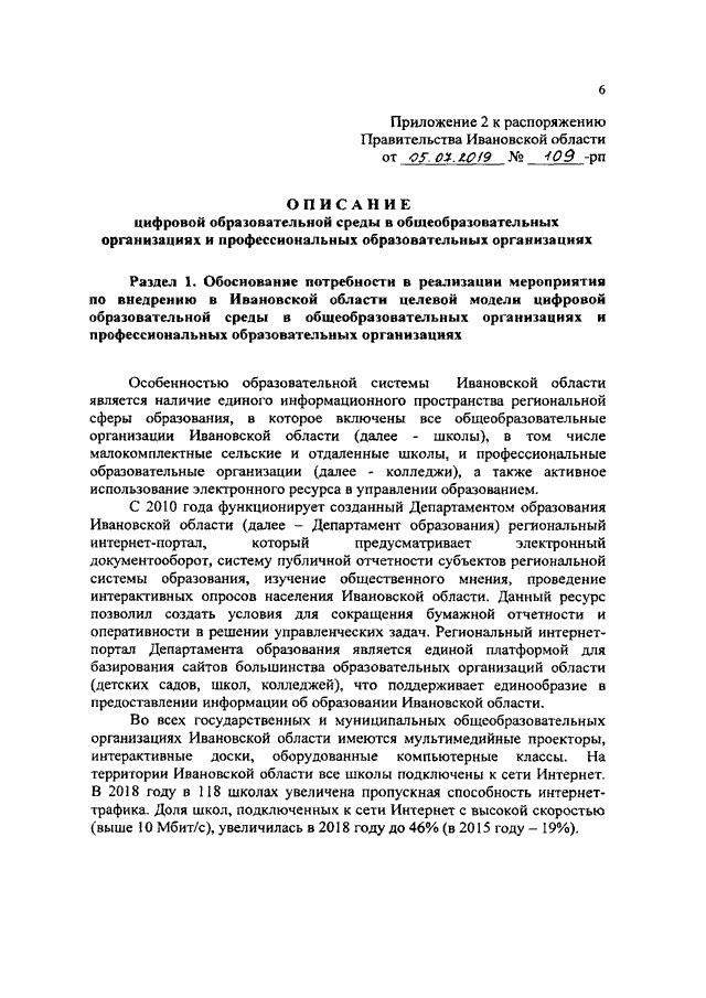 Распоряжение Правительства Ивановской области от 05.07.2019 N 109-рп "О внедрении в Ивановской области целевой модели цифровой образовательной среды в общеобразовательных организациях и профессиональных образовательных организациях на 2020 - 2022 годы"