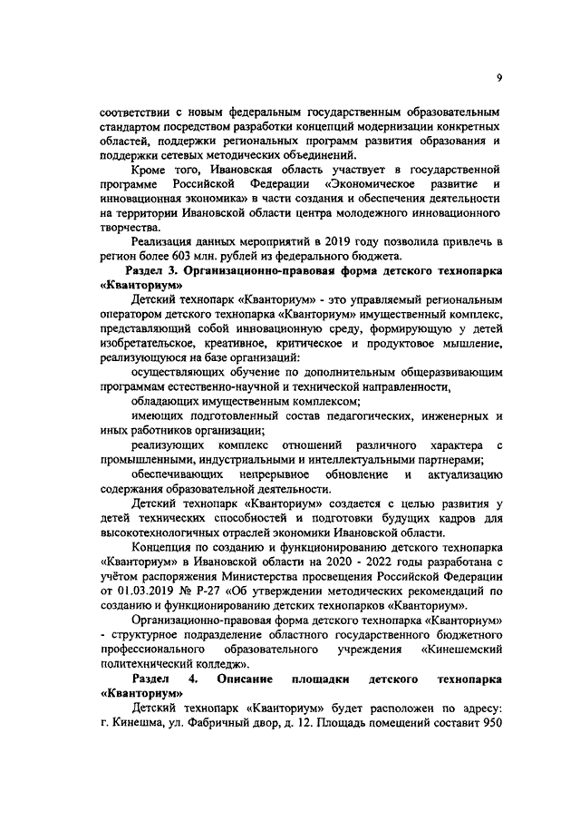 Распоряжение Правительства Ивановской области от 05.07.2019 N 110-рп "О концепции по созданию детского технопарка "Кванториум" в Ивановской области на 2020 - 2022 годы"