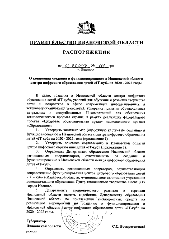 Распоряжение Правительства Ивановской области от 05.07.2019 N 111-рп "О концепции создания и функционирования в Ивановской области центра цифрового образования детей "IT-куб" на 2020 - 2022 годы"