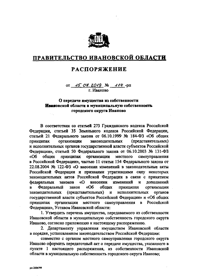 Распоряжение Правительства Ивановской области от 15.07.2019 N 114-рп "О передаче имущества из собственности Ивановской области в муниципальную собственность городского округа Иваново"
