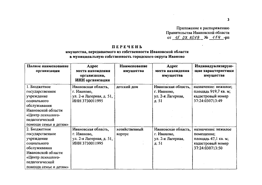 Распоряжение Правительства Ивановской области от 15.07.2019 N 114-рп "О передаче имущества из собственности Ивановской области в муниципальную собственность городского округа Иваново"