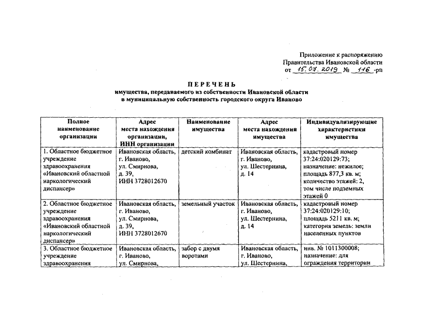 Распоряжение Правительства Ивановской области от 15.07.2019 N 116-рп "О передаче имущества из собственности Ивановской области в муниципальную собственность городского округа Иваново"