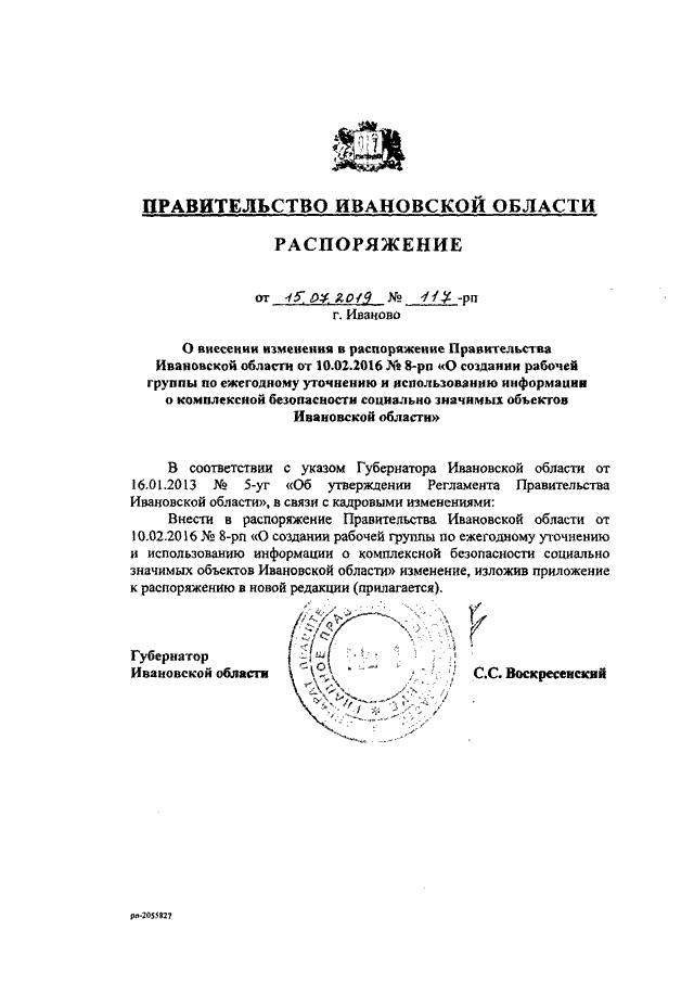 Распоряжение Правительства Ивановской области от 15.07.2019 N 117-рп "О внесении изменения в распоряжение Правительства Ивановской области от 10.02.2016 N 8-рп "О создании рабочей группы по ежегодному уточнению и использованию информации о комплексной безопасности социально значимых объектов Ивановской области"