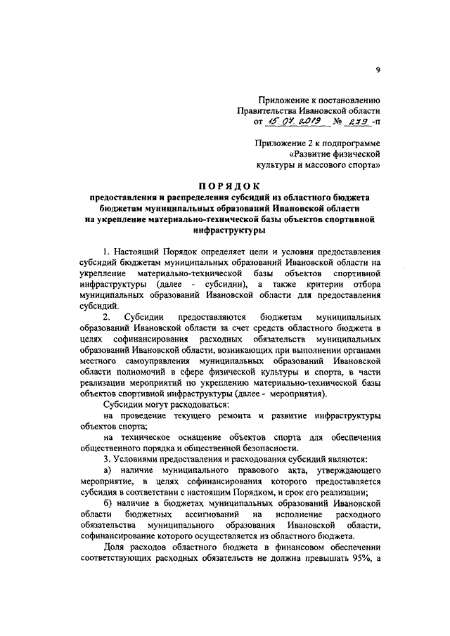 Постановление Правительства Ивановской области от 15.07.2019 N 279-п "О внесении изменений в постановление Правительства Ивановской области от 18.02.2016 N 43-п "Об утверждении государственной программы Ивановской области "Развитие физической культуры и спорта в Ивановской области" (вместе с "Порядком предоставления и распределения субсидий из областного бюджета бюджетам муниципальных образований Ивановской области на укрепление материально-технической базы объектов спортивной инфраструктуры")