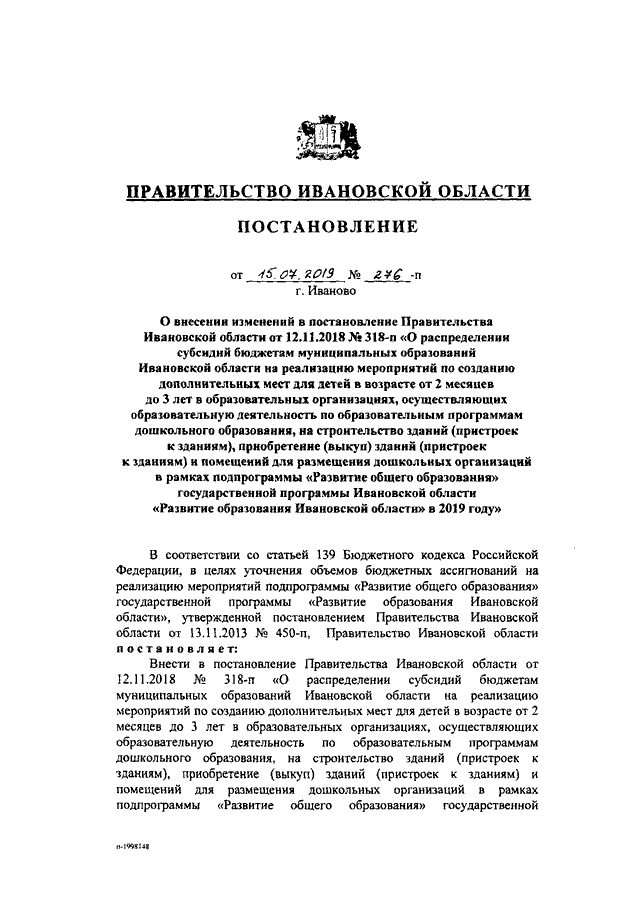 Постановление Правительства Ивановской области от 15.07.2019 N 276-п "О внесении изменений в постановление Правительства Ивановской области от 12.11.2018 N 318-п "О распределении субсидий бюджетам муниципальных образований Ивановской области на реализацию мероприятий по созданию дополнительных мест для детей в возрасте от 2 месяцев до 3 лет в образовательных организациях, осуществляющих образовательную деятельность по образовательным программам дошкольного образования, на строительство зданий (пристроек к зданиям), приобретение (выкуп) зданий (пристроек к зданиям) и помещений для размещения дошкольных организаций в рамках подпрограммы "Развитие общего образования" государственной программы Ивановской области "Развитие образования Ивановской области" в 2019 году"
