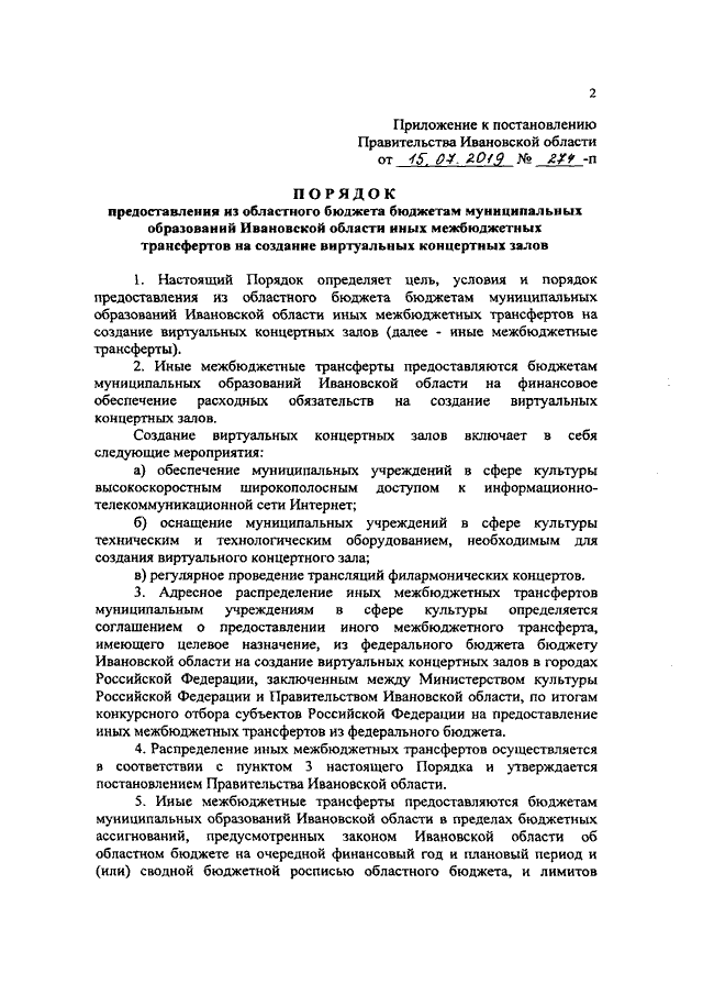 Постановление Правительства Ивановской области от 15.07.2019 N 274-п "Об утверждении Порядка предоставления из областного бюджета бюджетам муниципальных образований Ивановской области иных межбюджетных трансфертов на создание виртуальных концертных залов"