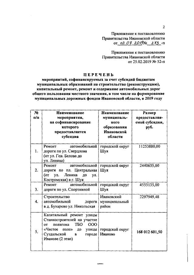 Постановление Правительства Ивановской области от 10.07.2019 N 273-п "О внесении изменения в постановление Правительства Ивановской области от 25.02.2019 N 52-п "Об утверждении перечня мероприятий, софинансируемых за счет субсидий бюджетам муниципальных образований на строительство (реконструкцию), капитальный ремонт, ремонт и содержание автомобильных дорог общего пользования местного значения, в том числе на формирование муниципальных дорожных фондов Ивановской области, в 2019 году"