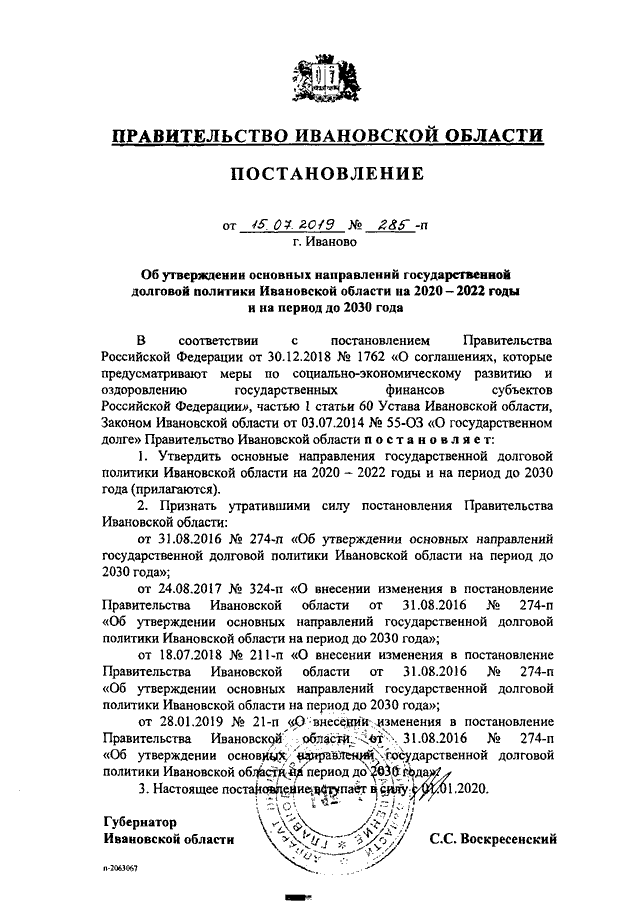 Постановление Правительства Ивановской области от 15.07.2019 N 285-п "Об утверждении основных направлений государственной долговой политики Ивановской области на 2020 - 2022 годы и на период до 2030 года"