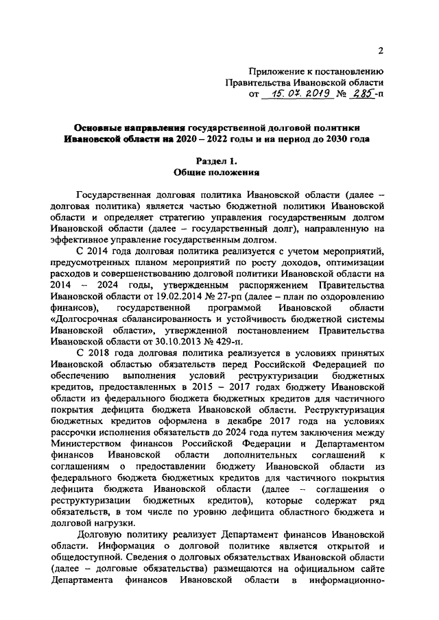 Постановление Правительства Ивановской области от 15.07.2019 N 285-п "Об утверждении основных направлений государственной долговой политики Ивановской области на 2020 - 2022 годы и на период до 2030 года"