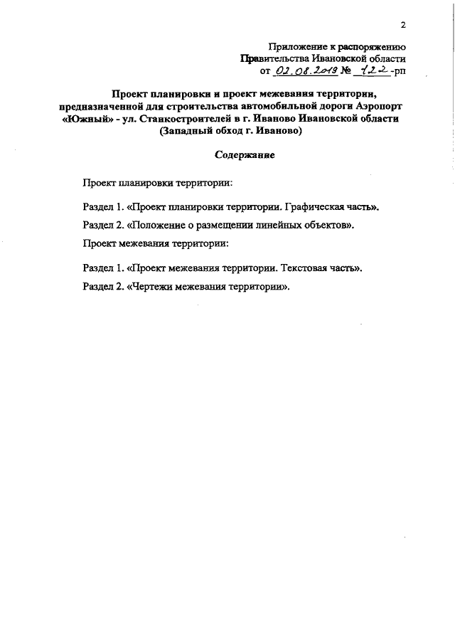 Распоряжение Правительства Ивановской области от 02.08.2019 N 122-рп "Об утверждении проекта планировки и проекта межевания территории, предназначенной для строительства автомобильной дороги Аэропорт "Южный" - ул. Станкостроителей в г. Иваново Ивановской области (Западный обход г. Иваново)"