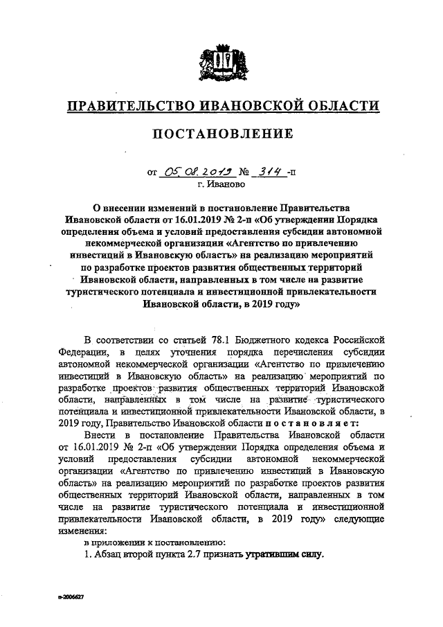 Постановление Правительства Ивановской области от 05.08.2019 N 314-п "О внесении изменений в постановление Правительства Ивановской области от 16.01.2019 N 2-п "Об утверждении Порядка определения объема и условий предоставления субсидии автономной некоммерческой организации "Агентство по привлечению инвестиций в Ивановскую область" на реализацию мероприятий по разработке проектов развития общественных территорий Ивановской области, направленных в том числе на развитие туристического потенциала и инвестиционной привлекательности Ивановской области, в 2019 году"