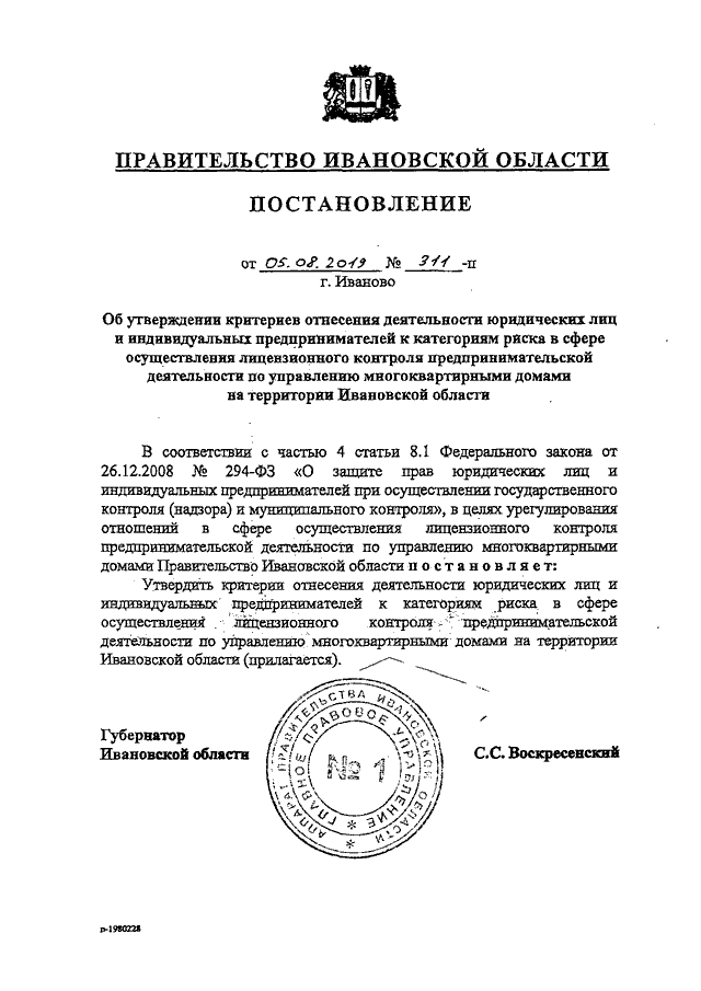 Постановление Правительства Ивановской области от 05.08.2019 N 311-п "Об утверждении критериев отнесения деятельности юридических лиц и индивидуальных предпринимателей к категориям риска в сфере осуществления лицензионного контроля предпринимательской деятельности по управлению многоквартирными домами на территории Ивановской области"