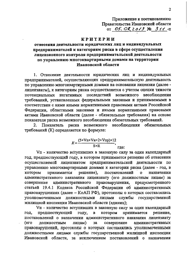Постановление Правительства Ивановской области от 05.08.2019 N 311-п "Об утверждении критериев отнесения деятельности юридических лиц и индивидуальных предпринимателей к категориям риска в сфере осуществления лицензионного контроля предпринимательской деятельности по управлению многоквартирными домами на территории Ивановской области"