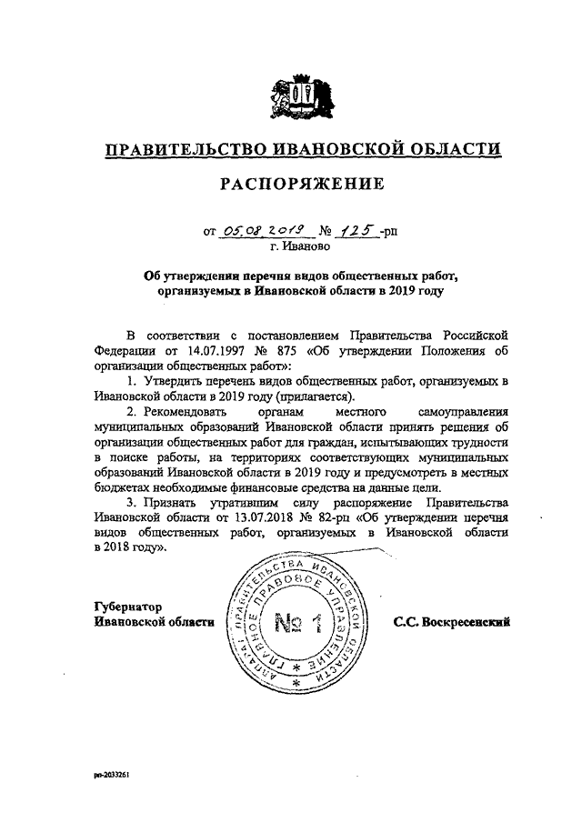 Распоряжение Правительства Ивановской области от 05.08.2019 N 125-рп "Об утверждении перечня видов общественных работ, организуемых в Ивановской области в 2019 году"