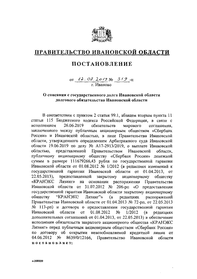 Постановление Правительства Ивановской области от 12.08.2019 N 319-п "О списании с государственного долга Ивановской области долгового обязательства Ивановской области"