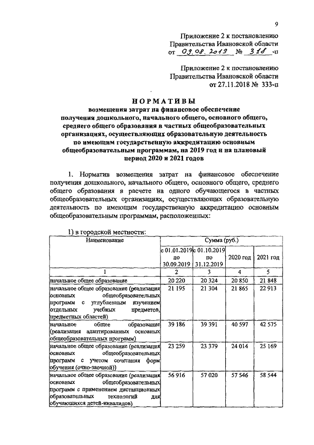 Постановление Правительства Ивановской области от 09.08.2019 N 318-п "О внесении изменений в постановление Правительства Ивановской области от 27.11.2018 N 333-п "Об утверждении нормативов обеспечения государственных гарантий реализации прав на получение общедоступного и бесплатного общего образования, обеспечения дополнительного образования в муниципальных образовательных организациях и возмещения затрат на финансовое обеспечение получения общего образования в частных образовательных организациях на 2019 год и на плановый период 2020 и 2021 годов" (вместе с "Нормативами обеспечения государственных гарантий реализации прав на получение общедоступного и бесплатного дошкольного, начального общего, основного общего, среднего общего образования в муниципальных общеобразовательных организациях, обеспечения дополнительного образования в муниципальных общеобразовательных организациях на 2019 год и на плановый период 2020 и 2021 годов", "Нормативами возмещения затрат на финансовое обеспечение получения дошкольного, начального общего, основного общего, среднего общего образования в частных общеобразовательных организациях, осуществляющих образовательную деятельность по имеющим государственную аккредитацию основным общеобразовательным программам, на 2019 год и на плановый период 2020 и 2021 годов", "Нормативами обеспечения государственных гарантий реализации прав на получение общедоступного и бесплатного дошкольного образования в муниципальных дошкольных образовательных организациях на 2019 год и на плановый период 2020 и 2021 годов", "Нормативами возмещения затрат на финансовое обеспечение получения дошкольного образования в частных дошкольных образовательных организациях на 2019 год и на плановый период 2020 и 2021 годов")
