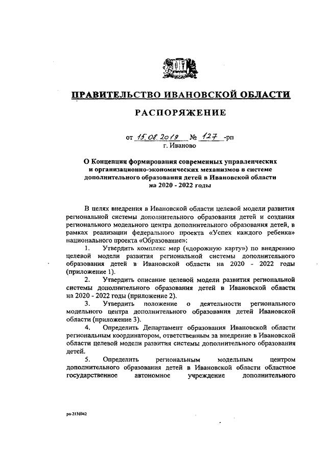 Распоряжение Правительства Ивановской области от 15.08.2019 N 127-рп "О Концепции формирования современных управленческих и организационно-экономических механизмов в системе дополнительного образования детей в Ивановской области на 2020 - 2022 годы" (вместе с "Положением о деятельности регионального модельного центра дополнительного образования детей Ивановской области")