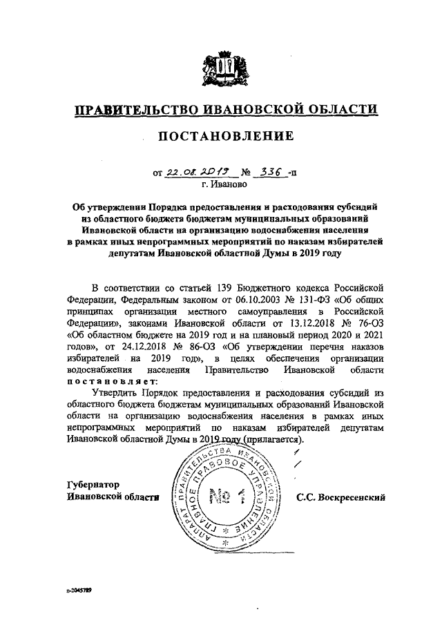 Постановление Правительства Ивановской области от 22.08.2019 N 336-п "Об утверждении Порядка предоставления и расходования субсидий из областного бюджета бюджетам муниципальных образований Ивановской области на организацию водоснабжения населения в рамках иных непрограммных мероприятий по наказам избирателей депутатам Ивановской областной Думы в 2019 году"