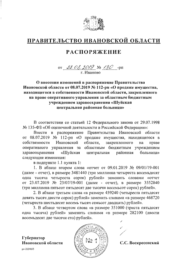 Распоряжение Правительства Ивановской области от 22.08.2019 N 130-рп "О внесении изменений в распоряжение Правительства Ивановской области от 08.07.2019 N 112-рп "О продаже имущества, находящегося в собственности Ивановской области, закрепленного на праве оперативного управления за областным бюджетным учреждением здравоохранения "Шуйская центральная районная больница"