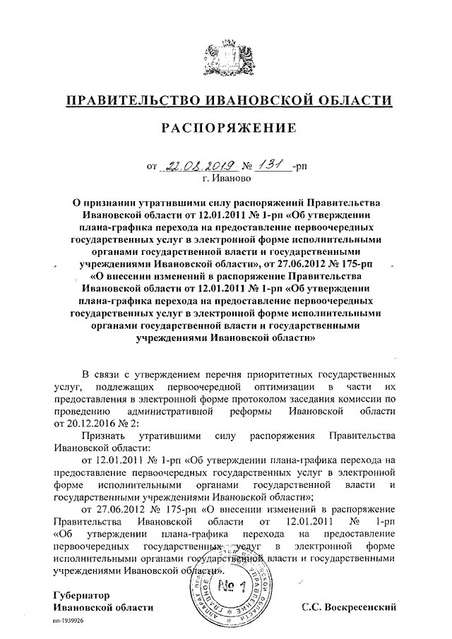 Распоряжение Правительства Ивановской области от 22.08.2019 N 131-рп "О признании утратившими силу распоряжений Правительства Ивановской области от 12.01.2011 N 1-рп "Об утверждении плана-графика перехода на предоставление первоочередных государственных услуг в электронной форме исполнительными органами государственной власти и государственными учреждениями Ивановской области", от 27.06.2012 N 175-рп "О внесении изменений в распоряжение Правительства Ивановской области от 12.01.2011 N 1-рп "Об утверждении плана-графика перехода на предоставление первоочередных государственных услуг в электронной форме исполнительными органами государственной власти и государственными учреждениями Ивановской области"