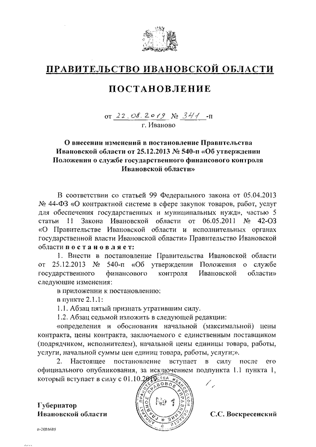 Постановление Правительства Ивановской области от 22.08.2019 N 341-п "О внесении изменений в постановление Правительства Ивановской области от 25.12.2013 N 540-п "Об утверждении Положения о службе государственного финансового контроля Ивановской области"