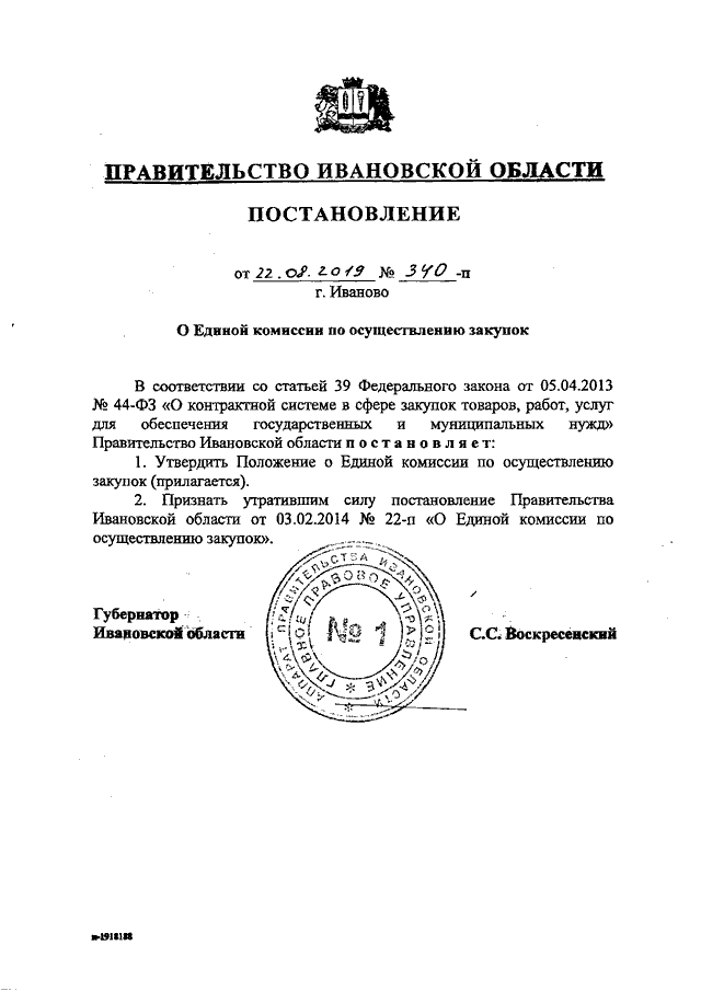 Постановление Правительства Ивановской области от 22.08.2019 N 340-п "О Единой комиссии по осуществлению закупок" (вместе с "Положением о Единой комиссии по осуществлению закупок")