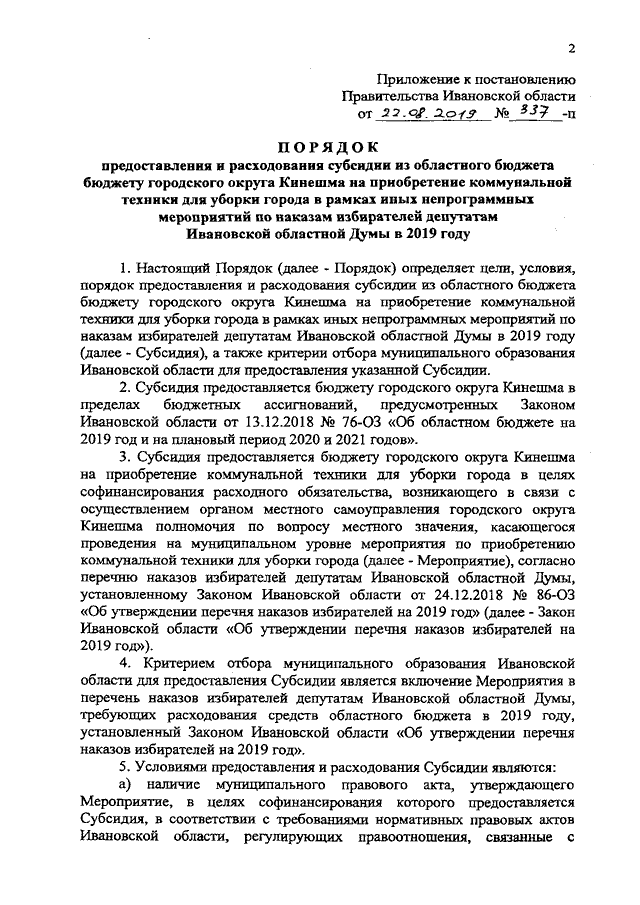 Постановление Правительства Ивановской области от 22.08.2019 N 337-п "Об утверждении Порядка предоставления и расходования субсидии из областного бюджета бюджету городского округа Кинешма на приобретение коммунальной техники для уборки города в рамках иных непрограммных мероприятий по наказам избирателей депутатам Ивановской областной Думы в 2019 году"