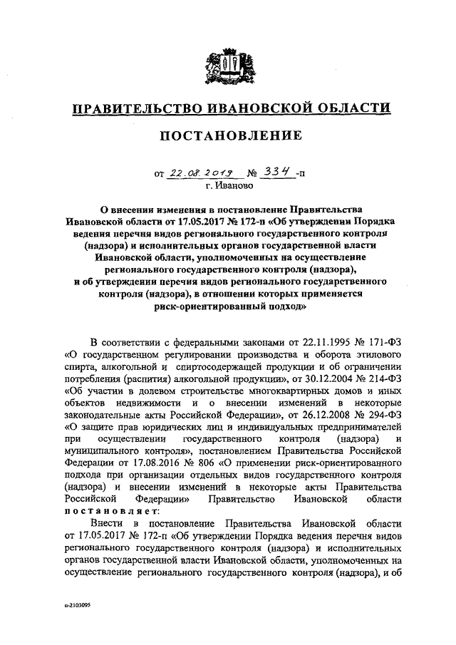 Постановление Правительства Ивановской области от 22.08.2019 N 334-п "О внесении изменения в постановление Правительства Ивановской области от 17.05.2017 N 172-п "Об утверждении Порядка ведения перечня видов регионального государственного контроля (надзора) и исполнительных органов государственной власти Ивановской области, уполномоченных на осуществление регионального государственного контроля (надзора), и об утверждении перечня видов регионального государственного контроля (надзора), в отношении которых применяется риск-ориентированный подход"