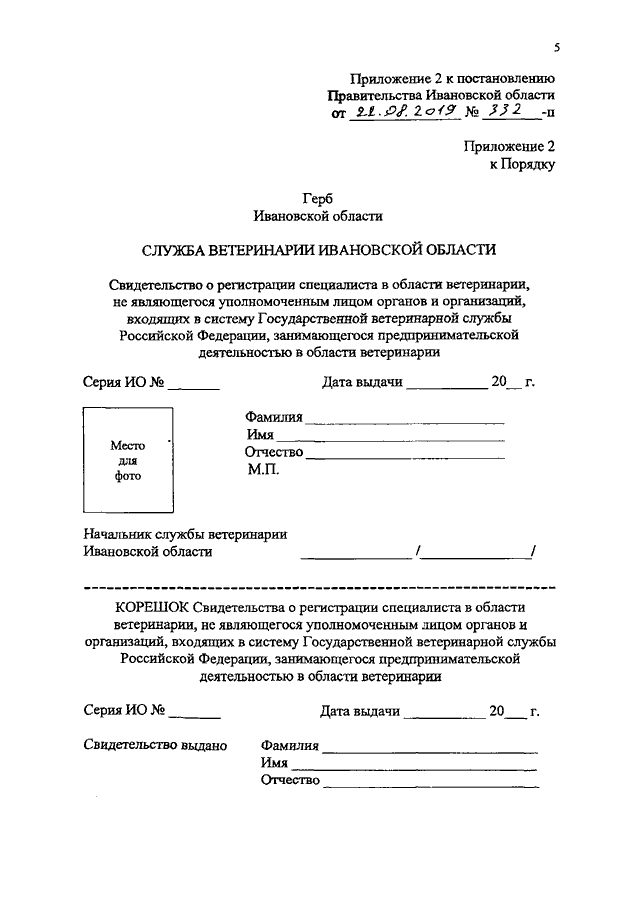 Постановление Правительства Ивановской области от 22.08.2019 N 332-п "О внесении изменений в постановление Правительства Ивановской области от 20.06.2007 N 150-п "Об утверждении Порядка регистрации специалистов в области ветеринарии, занимающихся предпринимательской деятельностью на территории Ивановской области"