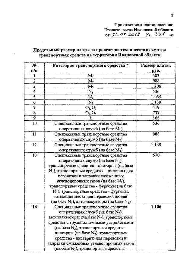 Постановление Правительства Ивановской области от 22.08.2019 N 331-п "Об установлении предельного размера платы за проведение технического осмотра транспортных средств на территории Ивановской области"