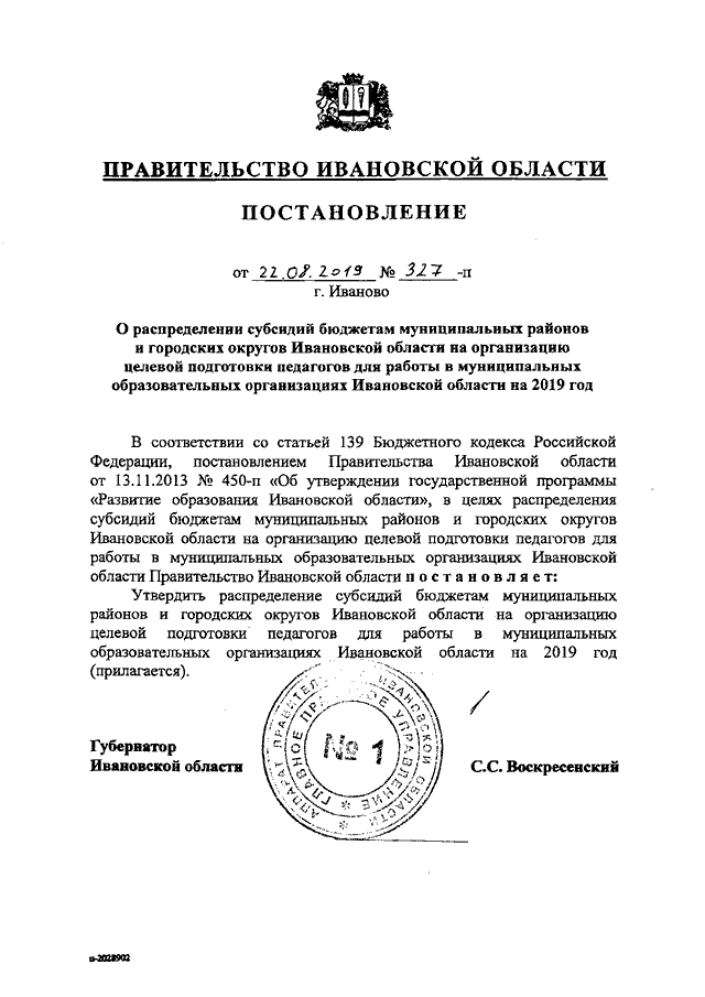 Постановление Правительства Ивановской области от 22.08.2019 N 327-п "О распределении субсидий бюджетам муниципальных районов и городских округов Ивановской области на организацию целевой подготовки педагогов для работы в муниципальных образовательных организациях Ивановской области на 2019 год"