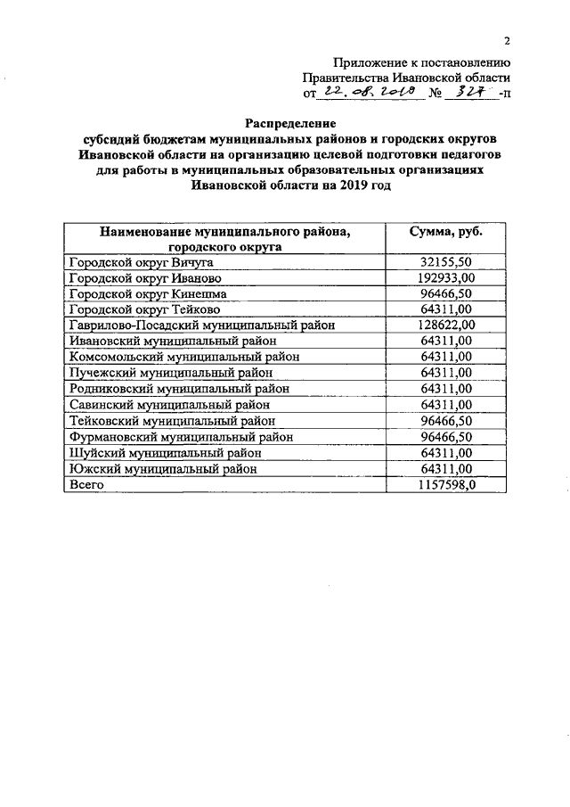 Постановление Правительства Ивановской области от 22.08.2019 N 327-п "О распределении субсидий бюджетам муниципальных районов и городских округов Ивановской области на организацию целевой подготовки педагогов для работы в муниципальных образовательных организациях Ивановской области на 2019 год"