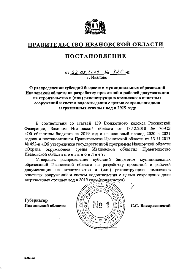 Постановление Правительства Ивановской области от 22.08.2019 N 326-п "О распределении субсидий бюджетам муниципальных образований Ивановской области на разработку проектной и рабочей документации на строительство и (или) реконструкцию комплексов очистных сооружений и систем водоотведения с целью сокращения доли загрязненных сточных вод в 2019 году"