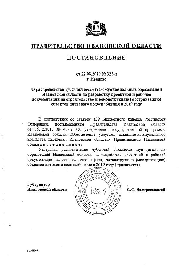 Постановление Правительства Ивановской области от 22.08.2019 N 325-п "О распределении субсидий бюджетам муниципальных образований Ивановской области на разработку проектной и рабочей документации на строительство и реконструкцию (модернизацию) объектов питьевого водоснабжения в 2019 году"